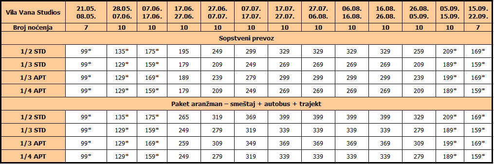 Termini označeni * čine paket aranžman (smeštaj + autobuski prevoz + trajekt) i nemaju umanjenje za sopstveni prevoz