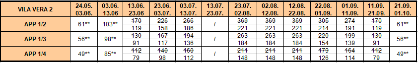 -Doplata za 1/1: dve cene iz tabele sa umanjenjem za jedan prevoz od 30€ (osim u terminima obeleženim ** i akciskim cenama )