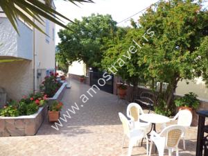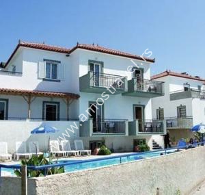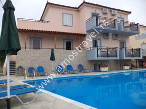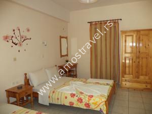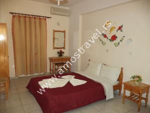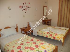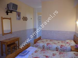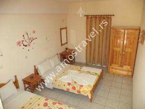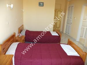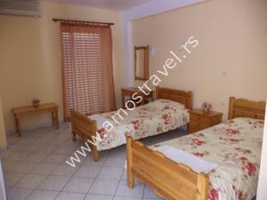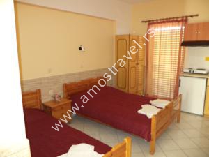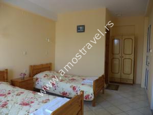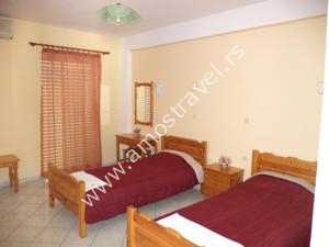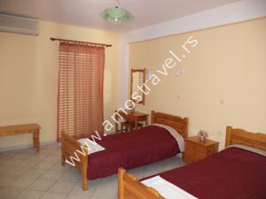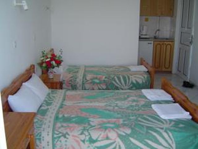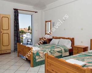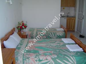 Sadržaj soba: Hotel ima ukupno 18 studija površine 20 m2 . U svakom studiju postoji: frižider, klima ( 5 eura/dnevno ), kupatilo sa tušem ,balkon sa stolom I stolicama. Sobe se čiste svaki drugi dan, a posteljina i peškiri se menjaju 3 puta za 10 dana.